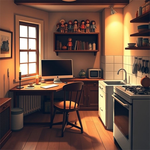 Hier entsteht Magie. Nicht in einem Studio mit Glaswand, nicht in einem Atelier mit weißen Böden – sondern dort, wo der Wasserkocher summt und das Licht leise über den Tisch kriecht. Zwischen Tassen, Steckdosen und einem Stapel unbezahlter Rechnungen wachsen Wesen aus Licht und Traum.